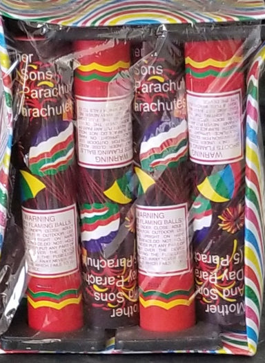 These single shot parachutes are assorted in the box and will have either smoke or crackle. But all will have long confetti streamers!
