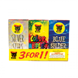 Effects:Blue Spider-Spider with yellow and blue sparkColor Medley-Silver chrysanthemum with purple and green sparkSilver Stars-Silver sparkle with ...